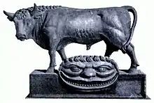 probably in reference to Milo of Croton,[11] an ancient Greek wrestler and strongman sometimes depicted as carrying a bull on his shoulders. The inn's former sign, described by Historic England as "a striking Mannerist relief carving of a huge mouth swallowing an ox",[12] was transferred to the Guildhall Museum[13] and is now in the garden of the Museum of London. The museum also owns a wood and plaster sculpture of a bull above a grinning mouth, originally donated to the Guildhall Museum by Henry Cecil Raikes MP postmaster general, 1887.[2][14]