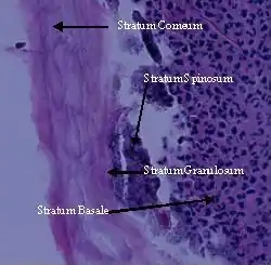 The epidermis is composed of four layers, stratum basale, stratum spinosum, stratum granulosum, and stratum corneum.[5]
