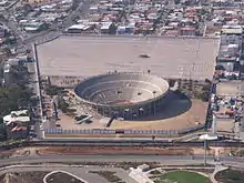 The Plaza Monumental de Tijuana (also called "Plaza Monumental de Playas de Tijuana" after the neighborhood in which it is located), and popularly known in English as the Bullring by the Sea, is a bullring in the city of Tijuana, Baja California, Mexico. It is currently used for bullfighting; the bullring has also been the scene for great boxing matches, concerts, cultural, and sporting events that have benefited the Tijuana community greatly.[1] The stadium holds 21,621 people and its opening was held on June 26, 1960. It is located just 60 meters from the United States border and one block from the Pacific Ocean.