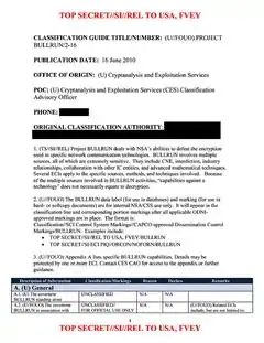According to the NSA's Bullrun Classification Guide, Bullrun is not a Sensitive Compartmented Information (SCI) control system or compartment, but the codeword has to be shown in the classification line, after all other classification and dissemination markings. Furthermore, any details about specific cryptographic successes were recommend to be additionally restricted (besides being marked Top Secret//SI) with Exceptionally Controlled Information labels; a non-exclusive list of possible Bullrun ECI labels was given as: APERIODIC, AMBULANT, AUNTIE, PAINTEDEAGLE, PAWLEYS, PITCHFORD, PENDLETON, PICARESQUE, and PIEDMONT without any details as to what these labels mean.[1][2]
