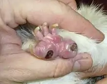 Bumblefoot (ulcerative pododermatitis) is a common bacterial infection and inflammatory reaction that occurs on the feet of birds, rodents, and rabbits.[1] It is caused by bacteria, namely species of Staphylococcus, Pseudomonas, and Escherichia, with S. aureus being the most common cause of the infection.[1] The aforementioned opportunistic bacteria occur naturally in the animal's environment, and infection occurs when one or a combination of these enters the body through a scrape or cut in the skin.[2] Bumblefoot can take various forms, but it usually looks like an abscess-like swelling with a central, dark-colored scab that may or may not ooze.[3] Sometimes, this swollen bump contains pus or cottage cheese-like material.[3] Alternately, the swelling could contain a hard lump[3] when these materials harden, or if the abscess becomes impacted with substrate (e.g. soil, straw, etc.)[3] Bumblefoot may also present as redness, swelling, small red sores, and depending upon severity and length of time with the condition, lesions, cracks, or discoloration.[2] Lameness puts more weight-bearing duty on an animal’s strong leg(s); this leads to excessive pressure being placed on the good foot (or feet), which increases the chance of an abrasion occurring that could develop a bumblefoot infection.[2] Consequently, in cases of lameness, the good leg(s) should be examined for potential cuts and infections.[2] Overweight animals are more at risk of developing bumblefoot for the same reason; their extra weight causes excessive pressure on their feet.[2] However, the infection can usually be attributed to poor husbandry practices,[1][4] so is much more likely to occur in captive animals than in those in the wild. Ulcerative pododermatitis is referred to as "sore hocks" when it affects a rabbit and "bumblefoot" when it affects a bird.[1] The terms "sore hocks" and "bumblefoot" are used interchangeably when describing ulcerative pododermatitis in rodents.[1]