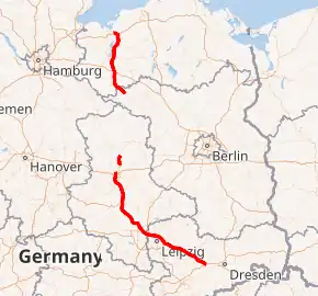 - The original A 14. A West-East route which starts at the A 2 near Magdeburg in Saxony-Anhalt and terminates at the A 4 at Dresden in Saxony. On the way, it serves Halle and Leipzig.