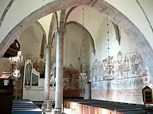 The most distinguishing feature of the interior is no doubt the richly painted walls, with murals executed by a master painter probably from Prussia or Bohemia.[1] These are from the late 14th century or early 15th and depict different Christian themes, like the Last Judgement, the crucifixion, a few of the apostles but also the Mass of Saint Gregory and legends of saints.[1][2][3] As for the previously mentioned depicted knights, scholars have different views of what they may depict or represent. One theory is that they are Teutonic knights.[1] Another claims that they represent a depiction of the Battle of Visby,[5] while others believe they are, in line with the other paintings, representing the Christian theme of the martyrdom of the Theban Legion.[2][3] A single remaining stained glass window remains, a baptismal font from the 13th century and an oddity: a mite box in stone, which is signed by the stonemason in runes, Lafrans made this stone.[2][3]