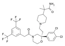 - Emonds-Alt X, Proietto V, Steinberg R, Oury-Donat F, Vigé X, Vilain P, et al. (December 2002). "SSR240600 [(R)-2-(1-[2-[4-[2-[3,5-bis(trifluoromethyl)phenyl]acetyl]-2-(3,4-dichlorophenyl)-2-morpholinyl]ethyl]- 4-piperidinyl)-2-methylpropanamide], a centrally active nonpeptide antagonist of the tachykinin neurokinin-1 receptor: I. biochemical and pharmacological characterization". The Journal of Pharmacology and Experimental Therapeutics. 303 (3): 1171–9. doi:10.1124/jpet.102.040162. PMID 12438541. S2CID 1467606.