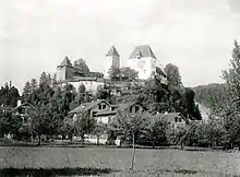During the High Middle Ages the land that would become Burgdorf was owned by the Kingdom of Burgundy and then after 1080 by the Dukes of Zähringen. Either the kings or the dukes built a castle on the left bank of the Emme river. Burgdorf is first mentioned in 1236 as in oppido Burchtorff, while Burgdorf Castle is mentioned in 1080 as castellum Bertoldi ducis.[5] The Zähringen dukes built a city (upper-west city section) around the castle in the last quarter of the 12th century. After the extinction of Zähringen line, Burgdorf passed to the Counts of Kyburg. They expanded the city in 1278 with the upper-east section and between 1278 and 1300 absorbed the Holzbrunnen settlement which became the lower town. By 1300 the city had expanded to fill the town walls. Starting in 1323 there was a ban on construction within the walls, which marked the border of the city until 1800. Under the Kyburg or Neu-Kyburg Counts, Burgdorf Castle was the capital of the county, and the Counts were the mayors of Burgdorf town.