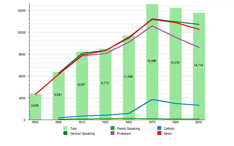 | Year | Total Population | German Speaking | French Speaking | Protestant | Catholic | Other | No religion given | Swiss | Non-Swiss | ||