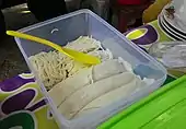 Main ingredientsFolded pancake made from rice flour, served in savoury coconut milk-based soup, often flavoured with fish, sprinkled with crispy fried shallot