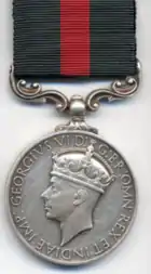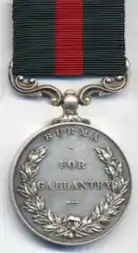 The Burma Gallantry Medal (BGM) was a military decoration awarded for acts of gallantry, in both war and peace, by Governor's commissioned officers, non-commissioned Officers and other ranks of the British Burmese military. These included its Army, Frontier Force, Military Police, Royal Naval Volunteer Reserve and Auxiliary Air Force.[1] Clasps, attached to the ribbon, could be awarded to mark further awards of the medal.[2]