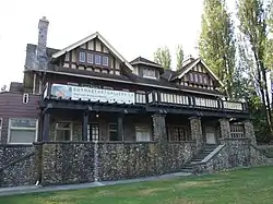 The Burnaby Art Gallery is located in Fairacres Mansion, which was designed by Robert Percival Sterling Twizell[4] (1875-1964).[5] Fairacres Mansion, also called Ceperley House, for its original owners, was built in 1910 at an estimated cost of C$150,000.00, making it the largest and most expensive house in Burnaby, BC of its time.[6] It was constructed in the Edwardian Arts and Crafts style with handmade fixtures, carpentry and tiled fireplaces. The grounds included horse stables, an aviary, gazebo and pergola, lagoons, strawberry fields, greenhouses, a steam plant and a gardener's cottage.[7] The tiles throughout the house were imported from England, fabricated by Conrad Dressler and his Medmenham Pottery. In the former billiards room and parlour, a grand oak mantelpiece, hand-carved by George Selkirk Gibson, bears a quote by Ralph Waldo Emerson: "The ornament of a house is the friends who frequent it."[8] On the death of the original owner, Grace Ceperley, the house was sold to a series of private owners. In 1939, it was acquired by Benedictine monks, and became an Abbey in 1953.[9] The Order vacated the house in 1954 when it moved to Westminster Abbey (British Columbia) in Mission. After the Benedictines sold the property, it was used by the Canadian Temple of More Abundant Life and as a fraternity house for Simon Fraser University's Delta Upsilon Fraternity.[10] In 1966, the Burnaby Art Society, led by Jack Hardman, Sheila Kincaid and Winifred Denny, among others, worked with the City of Burnaby to purchase the 3.4 hectares (8.4 acres) site for C$166,000.00. The Burnaby Art Gallery opened its doors in June 1967.[11]