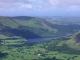 Burnbank Fell marks the northwestern perimeter of the Lakeland Fells, its feet set on the boundary of the National Park. Beyond lie the valley of the River Marrom and the industrial towns of the coastal plain. Beyond the park boundary is the low double top of Mockerkin How (810 ft) standing above Mockerkin Tarn. A natural water body, the Tarn is known for its water lilies, is stocked with eel, pike and perch, and is associated with several local legends, including that of a sunken town.[2]