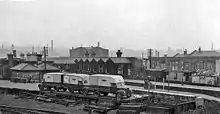 However the cutbacks of the 1960s affected the station badly, with through trains to Manchester via Bury ending in 1964 (two years before the withdrawal of the Accrington to Bury service) and those to Liverpool in 1969 whilst the line to Skipton was closed to all traffic in 1970.[5] This left the station on a 6+1⁄2 miles (10.5 km)-long dead-end branch line from Rose Grove to Colne, although the line remained double as far as Nelson until December 1986. The eastbound line and platform (used by trains towards Colne) was taken out of use thereafter and the station signal box closed - the track was subsequently lifted and the box and platform demolished a few years later. Only part of the remaining (former westbound) platform is now used by passenger trains - the rest is fenced off and overgrown. Immediately to the west, the line passes above the centre of the town on Bank Top viaduct as it heads towards Gannow Junction.
