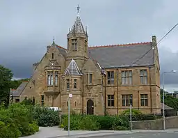 The school seems to have been in decline in second half of the 19th century, even as the town rapidly expanded around it. An education commissioner's report from the late 1860s showed attendance to be low and the schoolhouse in a poor state. Wealthy families shunned the school in favour of distant boarding schools, and several attempts to raise funds for a new building failed.[5] During 1871 the Governors of the school agreed to allow representatives of the Town Council and School Board to join them, in return for financial aid. This resulted in the 1874 opening of new school buildings across Bank Parade (53.793°N 2.241°W),[6] which can still be seen today.[7] Despite an agreement at this time to establish a girls department once funding could be established, no action was taken. By the late 1890s, it looked like the school board would create a rival higher grade school,[8] which would likely be disastrous for the grammar school. Some girls were allowed to attend from 1903 and it was taken over entirely by the council in 1904. It was decided that an equivalent girls school should be created and Burnley High School for Girls opened in Ormerod Road in 1910 (53.793°N 2.238°W). It moved to a new building in the former grounds of Ivy Bank House in the 1951 (53.794°N 2.288°W).[9] In 1959 the grammar school moved once again to larger premises on Byron Street (53.795°N 2.293°W), neighboring the girls school[1] with Ivy Bank Secondary Modern School also constructed on the site in the 1960s.