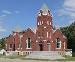 It is a two-story, red brick and limestone structure with a hipped roof. It was deemed notable as "a late Victorian example of Richardson[ian] Romanesque architecture in a small Kansas town."[2]