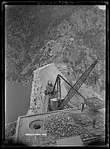 Construction commenced in 1907. Prior to about February 1911, the dam was known as Barren Jack, a corruption of the Aboriginal name of the locality.[13][14] A 2 ft (610 mm) narrow gauge railway was constructed from the New South Wales Government Railways' Main Southern Line at Goondah to bring materials to the site.[15][16] The railway was about 45 kilometres (28 mi) long, had a grade of 1 in 30 and some 90 foot-radius curves and took about 2 hours and 20 minutes to traverse.[17]