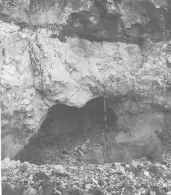 The Burro Mesa Archeological District encompasses a quarry in Big Bend National Park used by Native Americans as a source of chert for chipped-stone tools. The quarry was used intermittently beginning in the paleoindian period starting about 12,000 to 13,000 years ago. The chert is found in a variety of colors and rests on top of tuff beds which themselves contain veins of kaolinite that was suitable for making claystone ornaments and beads. The quarry area is carpeted with lithic debris from the initial knapping process by which chert was rough-shaped into material of suitable size and shape for later refinement at more convenient locations.[3]