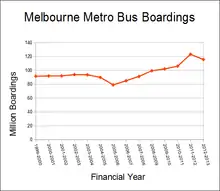 Post World War II, bus use in Melbourne peaked in 1952–1953 at 157 million passenger trips. Melbourne's total population at the time was 1.5 million meaning that on average each resident used a bus 100 times per year. By 1980–1981, patronage had fallen to a low of 71.5 million passenger trips for a population of 2.8 million - meaning that trips per capita had fallen to 25 per annum.[8] In the 2013-2014 financial year, a total of 127.6 million passenger trips were recorded on Melbourne's buses by its 4.3 million residents. While this was an increase of 10.2 percent on the previous year[1] and continued the trend of the previous decade, patronage was still only 29 trips per capita per annum.[8][9]
