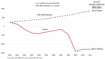 The U.S. fiscal position changed dramatically for the worse during the Bush years. CBO projected in its January 2001 baseline that the U.S. would have a total of $5.6 trillion in annual surpluses over the 2002-2011 decade, assuming the laws in place during the Clinton era continued and the economy performed as expected. However, the actual deficits during those years ended up being $6.1 trillion, a negative swing of $11.7 trillion. Two recessions, two wars, and tax cuts were the primary drivers of the differences.[7][36]