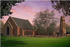 The adjacent Bell Tower is the tallest point on campus at approximately 69 ft tall. It houses 24 bronze carillon bells.[1]