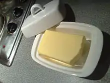 A butter dish is defined as "a usually round or rectangular dish often with a drainer and a cover for holding butter at table".[1] Before refrigerators existed, a covered dish made of crystal, silver, or china housed the butter.[2] The first butter dish was made by Simpson, Hall, Miller, and Co. around 1880 in Connecticut, out of silver.[3] These butter dishes were made to hold the traditional round shape of butter at the time and came with an "ice chamber" to keep the butter cold.[4] Another type of butter dish, a French butter dish, keeps butter fresh by using water to keep the butter away from the air, thereby keeping it fresh.[5] The water is placed into the base of the dish and the butter is put into a bell-shaped lid, creating an air seal.[6]