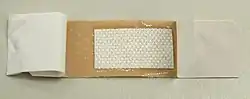An adhesive bandage is a small, flexible sheet of material which is sticky on one side, with a smaller, non-sticky, absorbent pad stuck to the sticky side. The pad is placed against the wound, and overlapping edges of the sticky material are smoothed down so they stick to the surrounding skin. Adhesive bandages are generally packaged in a sealed, sterile bag, with a backing covering the sticky side; the backing is removed as the bandage is applied. They come in a variety of sizes and shapes.