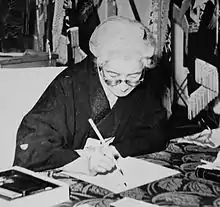 In 1945, Kaori, who was a student soldier, died in an air strike by the US military. From this experience of hers, she launched the "Kokusai Hibo no Kai" (International Society of Sad Mothers) and launched peace-proclaiming activities in various parts of Japan.[1] During and after the Second World War, Yanagiwara became more and more interested in peace activism and religion.[3][2]