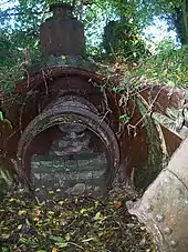 Rag Mill in Slaughterford, also known as Overshot Mill. A mill leat, now filled in, ran for over three quarters of a kilometre from the sluices just downstream of the Doncombe Brook confluence to an overshot wheel in a fulling mill on this site. In the 1890s, rag processing machinery was installed at the mill, and the undershot wheel, which can still be seen on the derelict site dates from that time, being served by a much shorter leat from the next sluice upstream from the mill. Also clearly identifiable on the site is the remains of a rag boiler. The mill, demolished in 1964, processed rags into individual fibres or "stuff", which was transported in vats of elm across the bridge to Chapps Mill for paper making. The water wheel power was supplemented by a gas engine, and ran shafts and pulleys to a cutting machine and conveyor belt, as well as a grindstone to sharpen the cutting machine blades.