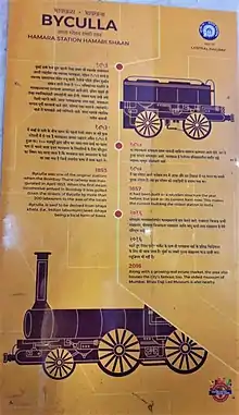 Byculla was one of the original stations when the Bombay–Thane railway was inaugurated in April 1853. It had been built as a wooden structure the year before, but took on its current form in 1857.[2] The first locomotive was brought to Mumbai through street of Byculla and around 200 laborers pulled it.[1]