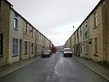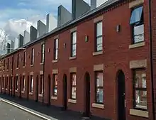 The greatest need at this time was for rental houses for the lowest paid workers. There also developed a need to build appropriate houses for skilled artisans and overseers. Building plots were sold to individuals, building clubs and building societies who would try to minimise the building and land costs. The earlier houses were built in terraces of eight to twelve houses, but as wealth, confidence and the demand for housing grew in the 1880s and 1890s, whole streets would be built together in the form of one long terrace.[9] Ginnels (entries) were set in after every fourth house, according to the Act.