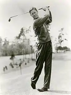 Nelson and two other legendary champions of the time, Ben Hogan and Sam Snead, were born within seven months of each other in 1912.[2][3] Although he won many tournaments in the course of his relatively brief career, he is mostly remembered today for having won 11 consecutive tournaments and 18 total tournaments in 1945. He retired officially at the age of 34 to be a rancher, later becoming a commentator and lending his name to the Byron Nelson Classic, the first PGA Tour event to be named for a professional golfer. As a former Masters champion he continued to play in that annual tournament, placing in the top-10 six times between 1947 and 1955 and as high as 15th in 1965.[4]