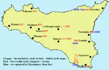 In 829, Michael II died and was succeeded by his son Theophilos. Theophilos received a mixed diet of success and defeat against his Arab opponents. In 830 AD the Arabs returned to Sicily and after a year-long siege took Palermo from their Christian opponents and for the next 200 years they were to remain there to complete their conquest, which was never short of Christian counters.[12] The Abbasids meanwhile launched an invasion of Anatolia in 830 AD. Al-Ma'mun triumphed and a number of Byzantine forts were lost. Theophilos did not relent and in 831 captured Tarsus from the Muslims.[13] Defeat followed victory, with two Byzantine defeats in Cappadocia followed by the destruction of Melitene, Samosata and Zapetra by vengeful Byzantine troops in 837. Al-Mu'tasim however gained the upper hand with his 838 victories at Dazimon, Ancyra and finally at Amorium[13]—the sack of the latter is presumed to have caused great grief for Theophilos and was one of the factors of his death in 842.