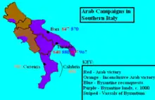 Like his murdered predecessor, the reign of Basil I saw a mixture of defeat and victory against the Arabs. Byzantine success in the Euphrates valley in the East was complemented with successes in the west where the Muslims were driven out of the Dalmatian coast in 873 and Bari fell to the Byzantines in 876.[17] However, Syracuse fell in 878 to the Sicilian Emirate and without further help Byzantine Sicily seemed lost.[17] In 880 Taranto and much of Calabria fell to Imperial troops. Calabria had been Rome's pre-Aegyptus bread basket, so this was more than just a propaganda victory.