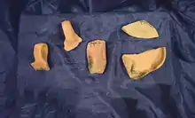 In 1768, 260 late Roman North African amphorae were found stacked in a chamber of the Kortin[upper-alpha 8] warehouses, twenty four of which had graffiti of a religious nature on them.[36] Given the distance from the main town, historians assume that these warehouse facilities were used for redistribution towards other harbours in the Central Mediterranean.[36] Large quantities of Byzantine era pottery were also found at the Kortin promontory in Marsa, with traces of a fire leading excavators to assume that the buildings and the quay were abandoned in late eight or early ninth century, with the date established due to the presence of globular amphorae on site.[37] The presence of earlier ceramics at the same level may indicate an earlier abandoning.[37]