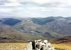 The summit of the mountain is a broad, flat north-south ridge with two cairned points 200 metres apart. The smaller northern cairn marks the summit and gives good views north to the Monar Forest Munros of Maoile Lunndaidh and Lurg Mhòr. It is also a good viewpoint for the corries and cliffs of nearby Sgurr na Lapaich.[5]