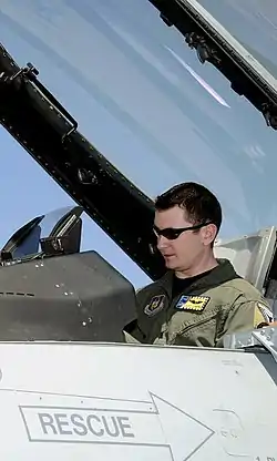 ![]() Lemoine seated in his F-16 at Homestead Reserve Base, Florida | |