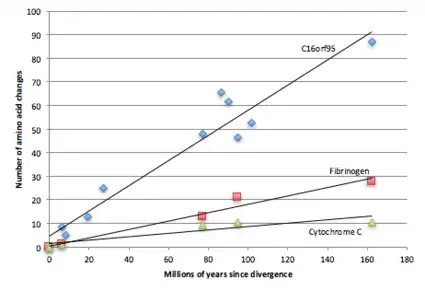 C16orf95 has a large number of amino acid changes over time, indicating it is a quickly evolving protein.