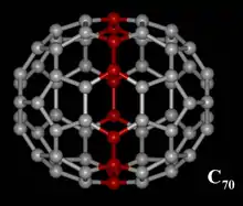 C70 fullerene is the fullerene molecule consisting of 70 carbon atoms. It is a cage-like fused-ring structure which resembles a rugby ball, made of 25 hexagons and 12 pentagons, with a carbon atom at the vertices of each polygon and a bond along each polygon edge. A related fullerene molecule, named buckminsterfullerene (C60 fullerene), consists of 60 carbon atoms.