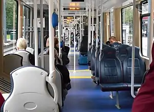 The Edinburgh trams are bi-directional, 42.8 metres (140 ft) long[1][11] and built with 100% low-floor access to meet UK Rail Vehicle Access Regulations for disabled people. Passenger capacity is 250 – 78 seated, 170 standing and 2 wheelchair spaces[1] – and the trams will be fitted with CCTV.[12]