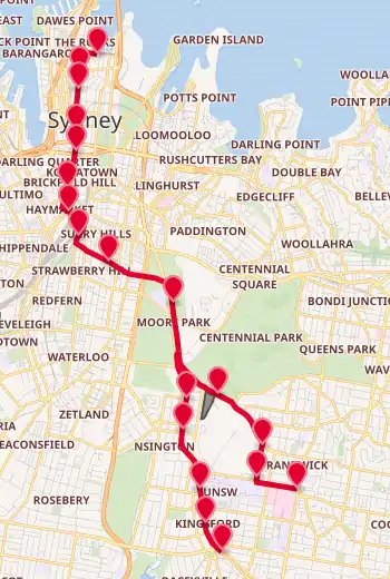 The line commences outside Circular Quay station heading west on Alfred Street, before proceeding south down George Street, then east via Rawson Place and Eddy Avenue, and south via Chalmers Street to Central station. It then continues east via Devonshire Street over the Eastern Distributor and under Moore Park and Anzac Parade via a tunnel before heading south via the former bus right of way. At the intersection of Anzac Parade and Alison Road, the line splits into two branches, L3 continues down Anzac Parade to terminate outside the South Sydney Junior Rugby League Club at Kingsford, and the L2 branch goes to Randwick via Alison Road, Wansey Road and High Street.[11]