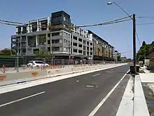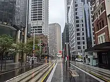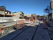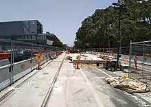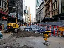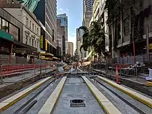 Major construction commenced on 23 October 2015, beginning in the section of George Street between King and Market Streets. To minimise disruption along the length of the corridor, works were staggered across 31 construction zones. The first section of track in the CBD was laid in December 2016, by which time a total of 410 metres of track had already been laid across the project.[28] This increased to around 5 kilometres of track by May 2017.[29] By October 2017, track installation reached the halfway mark, with 12,000 metres of track laid at 23 of the 31 zones along the alignment.[30]