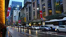 To accommodate construction of the light rail on George Street, new bus timetables were introduced on 4 October 2015. Buses were diverted from George Street on to other streets in the CBD, including Elizabeth, Castlereagh, Park, Druitt, Clarence and York Streets.[31] Some routes had their terminus changed to such places as Railway Square, Queen Victoria Building and King Street Wharf. A small number of routes were either combined so that they run through the CBD without terminating, removed from the CBD entirely or completely discontinued.[32][33][34][35][36]
