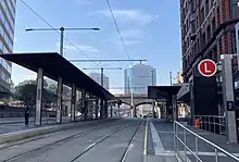 The Bridge Street stop, known as Grosvenor Street during development,[82] is located on George Street, near the intersections with Bridge Street and Grosvenor Street.[83] The design includes an island platform. The design originally included two side platforms but was switched to an island platform to retain the existing dedicated left-hand turning lane from George Street into Grosvenor Street.[17]