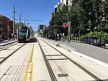 The Wynyard stop serves the locality of Wynyard. The stop is located at the northern end of the George Street pedestrian zone, adjacent to the entrance to Wynyard railway station. The design includes two side platforms.[81]