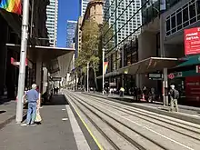 A pedestrian zone was established along approximately 40% of George Street, between Bathurst and Hunter Streets.[11][16][17] The pedestrian zone is being extended southwards to Rawson Place in Haymarket as of March 2021 (see Post-opening works).
