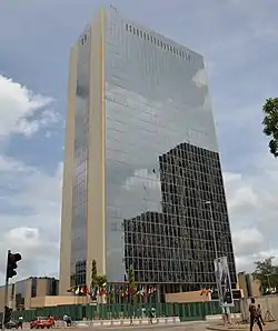 The CCIA Building, (long form Abidjan International Trade Center Building), is a skyscraper located on Rue Jean-Paul II, in the Plateau community of Abidjan, Côte d'Ivoire. Built in 1982 and topping out at 94 metres (308 ft) tall, it is the fourth-tallest building in Abidjan. It is part of a group of buildings planned in the 1970s and intended for use as offices and headquarters for publicly traded companies. Its architecture differs from other buildings in the neighborhood, with two long faces almost exclusively covered in tinted windows that reflect colors in the sky.