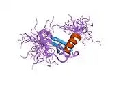 CCL11 is a small cytokine belonging to the CC chemokine family. CCL11 selectively recruits eosinophils by inducing their chemotaxis, and therefore, is implicated in allergic responses.[7][8][9] The effects of CCL11 are mediated by its binding to a G-protein-linked receptor known as a chemokine receptor. Chemokine receptors for which CCL11 is a ligand include CCR2,[10] CCR3[5] and CCR5.[10] However, it has been found that eotaxin-1 (CCL11) has high degree selectivity for its receptor, such that they are inactive on neutrophils and monocytes, which do not express CCR3.[11]