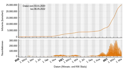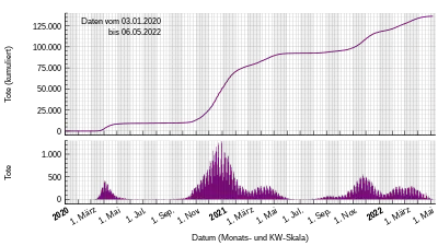 The COVID-19 pandemic in Germany has resulted in 25,033,970[3] confirmed cases of COVID-19 and 135,942[3] deaths.