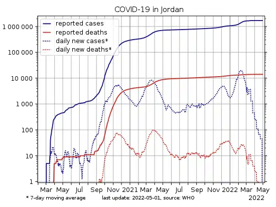 The COVID-19 pandemic in Jordan is part of the worldwide pandemic of coronavirus disease 2019 (COVID-19) caused by severe acute respiratory syndrome coronavirus 2 (SARS-CoV-2). On 2 March 2020, the Ministry of Health confirmed the first case in Jordan.
