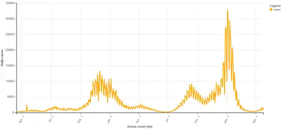 As of August 1, a total of 1,130,134 cases had been reported leading to 61,939 hospitalizations.[91] As of August 12, a total of 1,152,590 cases had been reported.[92] As of August 20, a total of 1,175,340 cases has been reported.[93] By August 27, the number of cases surpassed 1.2 million.[94]