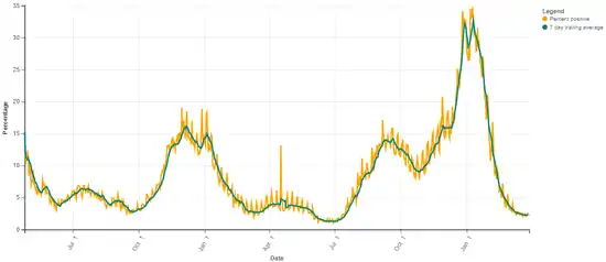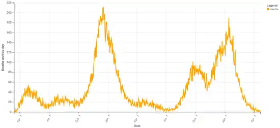 By January 3, 2021, the total number of deaths had increased to 9,076.[70] By January 6, the number of total hospitalizations had increased to 40,104.[71] By January 7, 753,068 total cases had been reported.[72] By January 14, 807,293 cases had been reported, leading to 9,990 deaths.[73] By January 15, the total number of deaths surpassed 10,000.[74] The number of deaths surpassed 11,000 on January 28.[75]