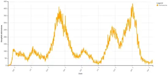 By March 23, there were a cumulative 442 COVID-19 cases, 6 of which resulted in death.[13] By April 5 there were 4,043 cases, 1,104 hospitalizations including 346 ICU admissions, and 119 deaths.[14] As of April 9, twenty percent of cases involved healthcare workers.[14] By April 13 there were 6,975 cases, 2,033 hospitalizations including 613 ICU admissions, and 274 deaths.[14]